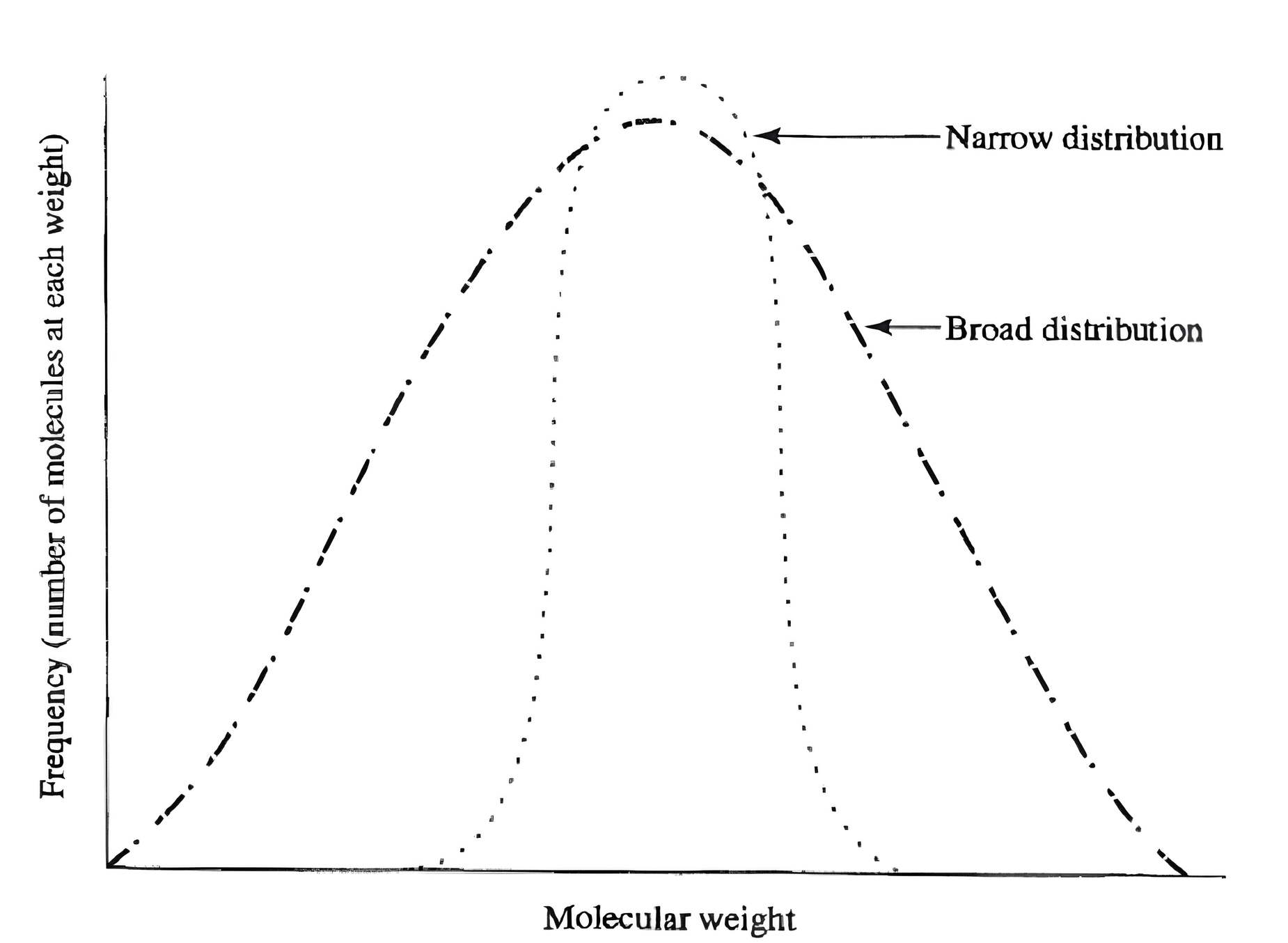 - اگر PDI بزرگتر از 1 باشد → توزیع پهنتر و اختلاف وزن زنجیرهها بیشتر است (در پلیمرهای واقعی همیشه >1 است)