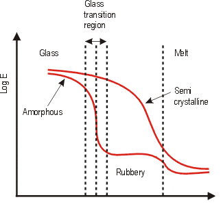 حجم آزاد بسیار کم است و حرکت زنجیرهها بسیار محدود است. - با عبور از دمای Tg
